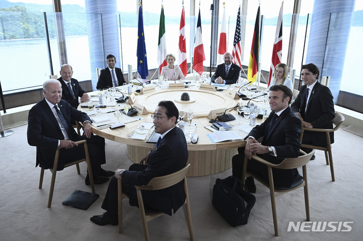 [히로시마=AP/뉴시스] 주요 7개국(G7) 정상회의 참가자들이 19일 일본 히로시마에서 회의하고 있다. 왼쪽부터 시계 방향으로 조 바이든 미국 대통령, 올라프 숄츠 독일 총리, 리시 수낵 영국 총리, 우르줄라 폰데어라이엔 유럽연합 집행위원장, 샤를 미셸 유럽이사회 의장, 조르자 멜로니 이탈리아 총리, 쥐스탱 트뤼도 캐나다 총리, 에마뉘엘 마크롱 프랑스 대통령, 기시다 후미오 일본 총리. 2023.05.19.