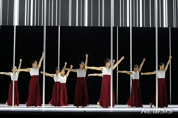 [서울=뉴시스] 박진희 기자 = 서울시무용단 '일무(佾舞)' 언론공개회가 열린 25일 서울 종로구 세종문화회관에서 무용수들이 3막 '죽무' 드레스 리허설을 하고 있다. '일무'는 국가무형문화제 제1호이자 유네스코 인류무형문화유산에 등재된 문화유산 '종묘제례악'에서 출발했다. '종묘제례악'은 조선시대 왕과 왕후의 신주를 모시는 '종묘'에서 거행되는 제례의식에 사용되는 기악과 노래, 춤을 말한다. 그 중에 제례무를 일컬어 '일무'라 하는데 하나로 열을 맞추어 춤을 춘다는 뜻이다. 2023.05.25. [email protected]