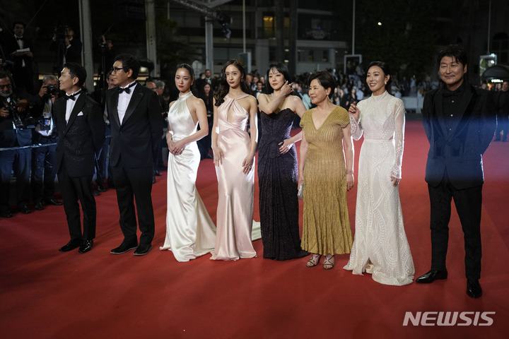 [칸=AP/뉴시스] 영화 '거미집' 출연진이 25일(현지시각) 프랑스 남부 칸에서 열린 제76회 칸 국제영화제 비경쟁 부문에 초청된 '거미집'(Cobweb) 시사회에 도착해 레드카펫을 밟고 있다. 왼쪽부터 배우 오정세, 김지훈 감독, 배우 전여빈, 크리스탈(정수정), 임수정, 박정수, 장영남, 송강호. 2023.05.26.
