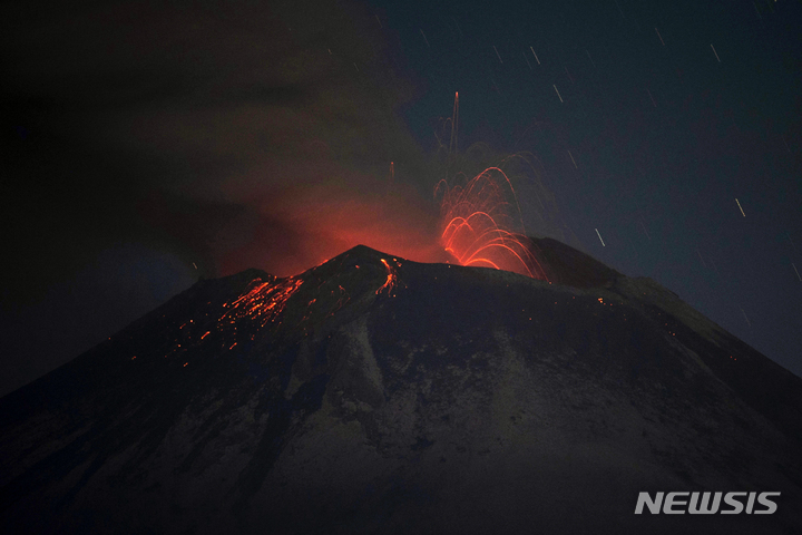 [산티아고 살리트신틀라=AP/뉴시스] 25일(현지시각) 멕시코 푸에블라주 산티아고 살리트신틀라에서 화산재와 용암을 분출하는 '포포카테페틀' 화산이 관측되고 있다. 2023.05.26.