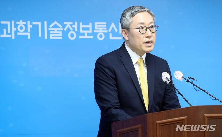 [세종=뉴시스] 강종민 기자 = 조선학 과학기술정보통신부 거대공공연구정책관이 26일 세종시 정부세종청사에서 지난 25일 우주 여정을 시작한 누리호 탑재 차세대소형위성 2호와 대전 및 해외 지상국을 통해 7차례 추가 교신이 이뤄졌다고 밝히고 있다. 2023.05.26. [email protected]