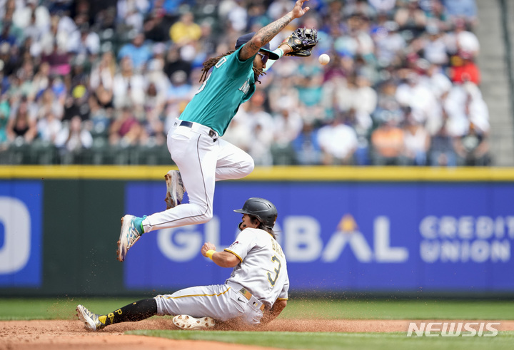 [시애틀=AP/뉴시스] 피츠버그 파이어리츠의 배지환(오른쪽)이 27일(현지시각) 미 워싱턴주 시애틀의 T모바일 파크에서 열린 2023 메이저리그 시애틀 매리너스와의 경기 2회 초 몸에 맞는 공으로 출루한 뒤 2루 도루에 성공하고 있다. 배지환은 1타수 무안타 1도루(시즌 15호)를 기록했고 팀은 0-5로 완패했다. 2023.05.28.