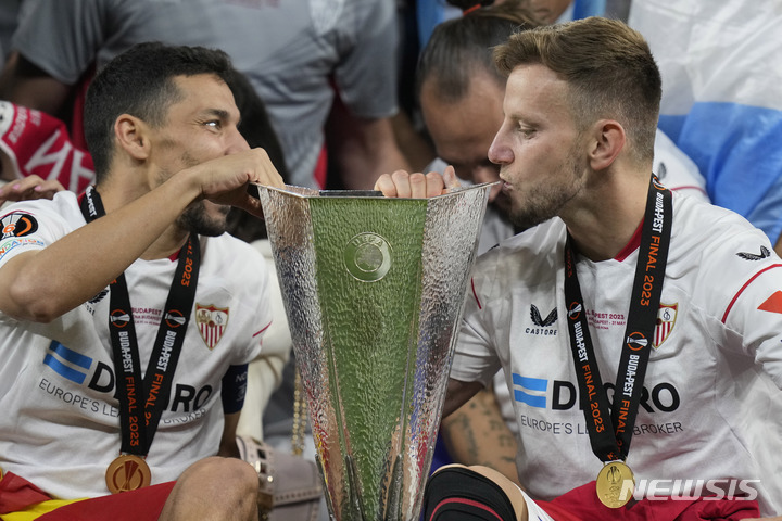 [부다페스트=AP/뉴시스] 세비야(스페인)의 이반 라키티치(오른쪽)이 지난달 31일(현지시각) 헝가리 부다페스트의 푸스카스 아레나에서 열린 2022~23 유럽축구연맹(UEFA) 유로파리그 정상에 올라 트로피에 입 맞추고 있다. 세비야는 결승전에서 AS로마(이탈리아)와 1-1로 비긴 후 승부차기 끝에 4-1로 승리하고 통산 7번째 유로파리그 우승을 달성했다. 2023.06.01.