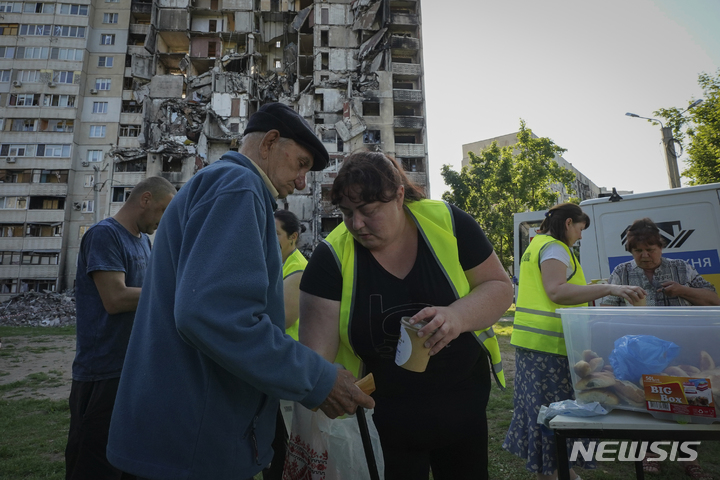 [하르키우=AP/뉴시스] 2일(현지시각) 우크라이나 하르키우에서 러시아 로켓 공격으로 아파트가 파손되는 피해를 입은 주민들이 아파트 주변에서 자원봉사자들이 나눠주는 무료 음식을 받고 있다. 2023.06.03.