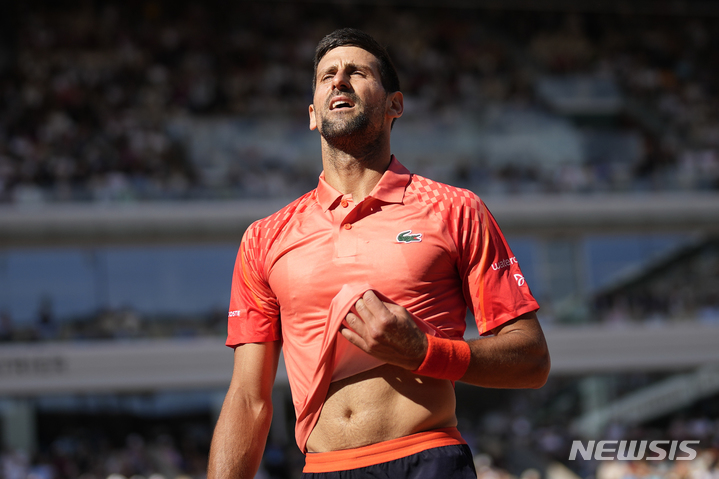 [파리=AP/뉴시스] 노바크 조코비치(3위·세르비아)가 2일(현지시각) 프랑스 파리의 스타드 롤랑가로스에서 열린 프랑스오픈 테니스 남자 단식 3회전에서 알레한드로 다비노비치 포키나(34위·스페인)와 경기하고 있다. 조코비치는 포키나를 3-0(7-6 7-6 6-2)으로 완파하고 16강에 올랐다. 2023.06.03.