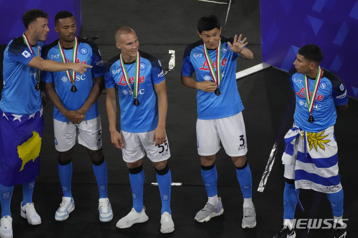 [나폴리=AP/뉴시스] 김민재(오른쪽 두 번째)가 4일(현지시각) 이탈리아 나폴리의 디에고 아르만도 마라도나에서 열린 2022-23 이탈리아 세리에A 38라운드 삼프도리아와의 경기에서 승리한 후 우승 메달을 목에 걸고 동료들과 기뻐하고 있다. 나폴리는 시즌 최종전에서 삼프도리아를 2-0으로 꺾고 승리했으며 경고 누적으로 출전하지 못한 김민재는 최우수 수비수 상을 받았다. 2023.06.05.