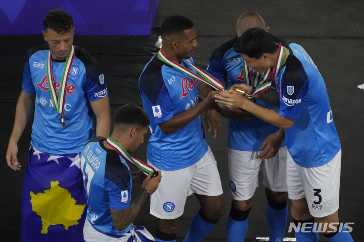 [나폴리=AP/뉴시스] 김민재(오른쪽)가 4일(현지시각) 이탈리아 나폴리의 디에고 아르만도 마라도나에서 열린 2022-23 이탈리아 세리에A 38라운드 삼프도리아와의 경기에서 승리한 후 우승 메달을 목에 걸고 동료들과 기쁨을 나누고 있다. 나폴리는 시즌 최종전에서 삼프도리아를 2-0으로 꺾고 승리했으며 경고 누적으로 출전하지 못한 김민재는 최우수 수비수 상을 받았다. 2023.06.05.