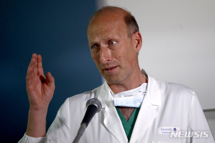 [로마=AP/뉴시스] 7일(현지시각) 이탈리아 로마의 아고스티노 제밀리 대학병원에서 프란치스코 교황의 수술을 집도한 의사 세르조 알피에라가 교황의 상태에 관해 설명하고 있다. 복부 탈장 수술을 받은 프란치스코 교황은 건강한 것으로 알려졌다. 2023.06.07.