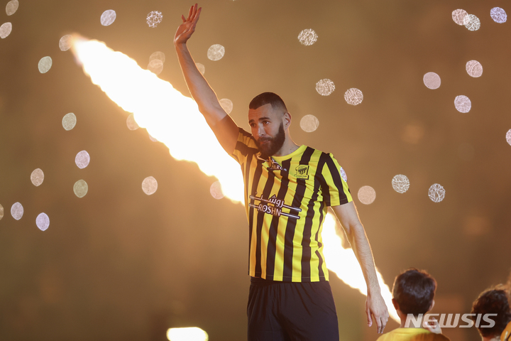 [제다=AP/뉴시스] 카림 벤제마가 8일(현지시각) 사우디아라비아 제다의 킹 압둘라 스포츠 시티 스타디움에서 열린 알이티하드 입단식에 참석해 팬들에게 인사하고 있다. 14년 648경기 만에 레알 마드리드를 떠난 벤제마는 지난 1월 알나스르에 입단한 전 마드리드 동료 크리스티아누 호날두와 경기를 앞두고 있다. 2023.06.09.