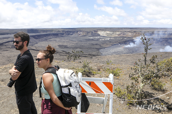 [하와이=AP/뉴시스] 지난 7일(현지시각) 미 하와이주 빅아일랜드에서 킬라우에아 화산의 폭발을 보기 위해 모여든 관광객들이 안내원의 얘기를 듣고 있다. 하와이 관광 당국은 킬라우에아 화산의 분출을 보기 위해 몰려드는 관광객들에게 안전을 위한 질서와 예절을 지킬 것을 촉구하고 있다. 2023.06.09.