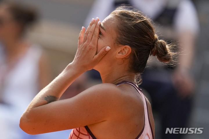 [파리=AP/뉴시스] 아리나 사발렌카(2위·벨라루스)가 8일(현지시각) 프랑스 파리의 스타드 롤랑가로스에서 열린 프랑스오픈 테니스 여자 단식 준결승에서 카롤리나 무호바(43위·체코)와 경기하고 있다. 올해 호주오픈 우승자인 사발렌카는 무호바에게 1-2(6-7<5-7> 7-6<7-5> 5-7)로 패해 탈락하며 세계 1위 자리에도 오르지 못했다. 2023.06.09.