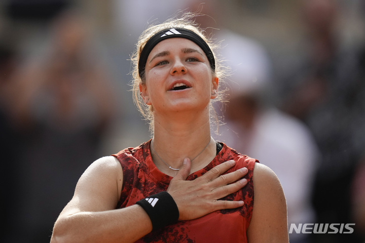 [파리=AP/뉴시스] 카롤리나 무호바(43위·체코)가 8일(현지시각) 프랑스 파리의 스타드 롤랑가로스에서 열린 프랑스오픈 테니스 여자 단식 준결승에서 아리나 사발렌카(2위·벨라루스)를 물리친 후 기뻐하고 있다. 무호바는 올해 호주오픈 우승자인 사발렌카를  2-1(7-6<7-5> 6-7<5-7> 7-5)로 꺾고 결승에 올라 이가 시비옹테크(1위·폴란드)와 우승을 다툰다. 2023.06.09.