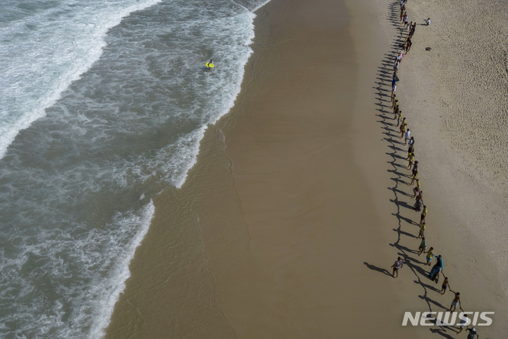 [리우데자네이루=AP/뉴시스] 세계 해양의 날인 8일(현지시각) 브라질 리우데자네이루 해변에서 사람들이 '바다를 안아주자'는 상징적인 의미로 서로 손을 잡고 인간 띠를 만들고 있다. 루트 브라질이라는 환경단체는 해양 오염에 대한 사람들의 관심을 높이기 위해 '댓 허그'(That Hug) 행사를 열고 사람들의 참가를 촉구했다. 2023.06.09.
