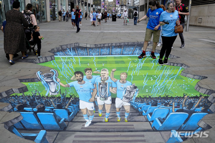 [맨체스터=AP/뉴시스] 12일(현지시각) 맨체스터 시티 선수들의 '트레블'(3관왕) 축하 퍼레이드가 열리는 영국 맨체스터 거리에 프리미어리그(EPL), FA컵, 챔피언스리그 트로피를 들고 있는 맨시티 선수들의 착시 그림이 그려져 있다. 2023.06.13.
