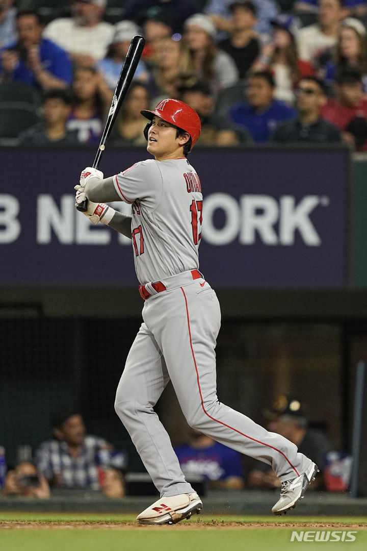 [알링턴=AP/뉴시스] 로스앤젤레스 에인절스의 오타니 쇼헤이가 12일(현지시각) 미 텍사스주 알링턴의 글로브라이프필드에서 열린 2023 메이저리그 텍사스 레인저스와의 경기 4-5로 뒤진 7회 초 동점 홈런을 치고 있다. 오타니는 시즌 19호 홈런을 터뜨려 아메리칸리그 홈런 공동 선두로 올라섰다. 2023.06.13.