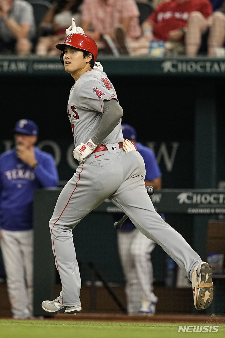 [알링턴=AP/뉴시스] 로스앤젤레스 에인절스의 오타니 쇼헤이가 12일(현지시각) 미 텍사스주 알링턴의 글로브라이프필드에서 열린 2023 메이저리그 텍사스 레인저스와의 경기 5-5 동점인 연장 12회 초 2점 역전 홈런을 치고 베이스를 돌고 있다. 오타니는 이날 동점 홈런(시즌 19호)과 역전 홈런(시즌 20호)을 터뜨려 팀의 9-6 승리를 이끌었고 아메리칸 리그 홈런 단독 선두에 올라섰다. 2023.06.13.