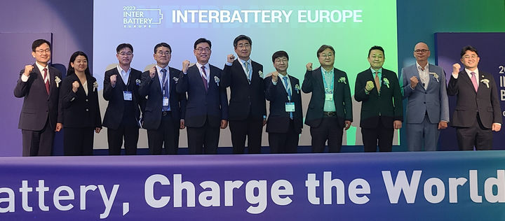 [서울=뉴시스] 14일(현지시간) 독일 뮌헨에서 열린 인터배터리 유럽 2023에서 참석자들이 기념촬영 하고 있다. 왼쪽부터 정순영 한국수출입은행 부행장, 조연주 한솔케미칼 부회장, 조한제 삼성SDI EU 법인장, 전춘우 KOTRA 이사, 박태성 한국배터리협회 부회장, 고경석 주프랑크푸르트 총영사, 이동기 코엑스 사장, 성환두 LG에너지솔루션 전무, 김종우 LS일렉트릭 사장, 악셀 와이안드 원준 독일지사 부사장, 김명규 충청북도 경제부지사. (사진=코엑스 제공) 2023.06.15. [email protected]