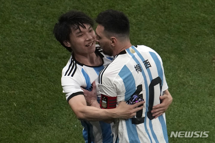 [베이징=AP/뉴시스] 15일 중국 베이징 노동자경기장에서 열린 아르헨티나와 호주의 축구 친선경기 중 한 중국 팬(왼쪽)이 경기장에 뛰어들어 리오넬 메시를 껴안으려 하고 있다. 이날 경기는 전반 79초 만에 터진 메시의 선제골과 후반 23분 저먼 페첼라의 추가 골로 아르헨티나가 2-0 승리를 거뒀다. 2023.06.16.