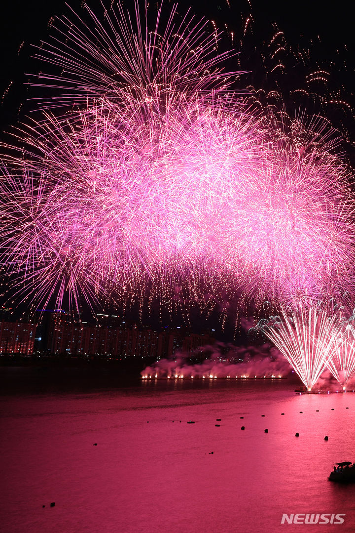 [서울=뉴시스] 조성우 기자 = 17일 오후 서울 영등포구 여의도 한강공원에서 열린 그룹 방탄소년단(BTS) 데뷔 10주년 기념 '2023 BTS 페스타'에서 불꽃쇼가 진행되고 있다. 2023.06.17. [email protected]