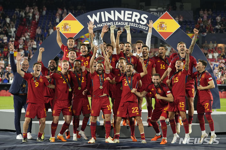 [로테르담=AP/뉴시스] 스페인 선수들이 18일(현지시각) 네덜란드 로테르담의 스타디온 페예노르트에서 열린 2022~23 유럽축구연맹(UEFA) 네이션스리그 정상에 올라 트로피를 들고 환호하고 있다. 스페인은 결승에서 크로아티아와 0-0으로 비겨 승부차기 끝에 5-4로 승리하며 우승을 차지했다. 2023.06.19.