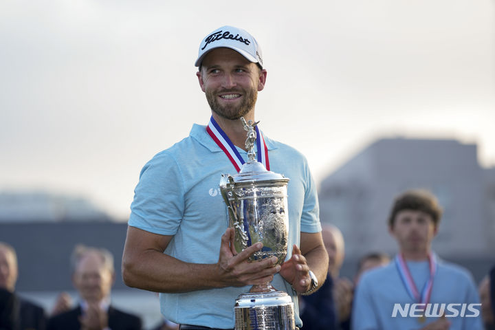 [로스앤젤레스=AP/뉴시스] 윈덤 클라크(미국)가 18일(현지시각) 미 캘리포니아주 로스앤젤레스의 LA컨트리클럽에서 열린 제123회 US오픈 정상에 올라 트로피를 들고 기념 촬영하고 있다. 클라크는 최종 합계 10언더파 270타로 로리 매킬로이(북아일랜드)를 1타 차로 제치고 우승하며 생애 첫 메이저대회 정상에 올랐다. 2023.06.19.