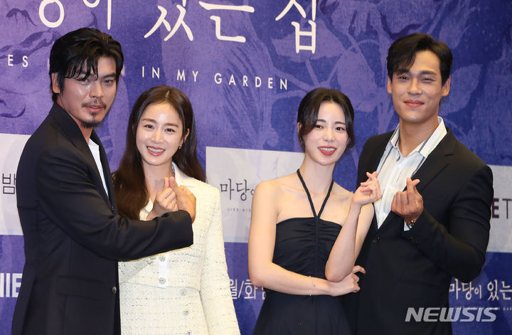 [서울=뉴시스] 권창회 기자 = 배우 김성오(왼쪽부터), 김태희, 임지연, 최재림이 19일 오후 서울 마포구 상암 스탠포드 호텔에서 열린 지니TV 드라마 마당이 있는 집 제작발표회에서 포토타임을 갖고 있다. 2023.06.19. [email protected]