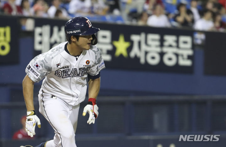 [서울=뉴시스] 김근수 기자 = 20일 서울 송파구 잠실야구장에서 열린 2023 프로야구 SSG 랜더스와 두산 베어스의 경기, 6회 말 2사 주자 1,2 상황에서 두산 김대한이 중견수 앞 동점 1루타를 치고 있다. 2023.06.20. [email protected]
