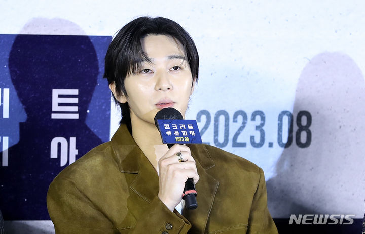 [서울=뉴시스] 최진석 기자 = 배우 박서준이 21일 서울 광진구 롯데시네마 건대입구점에서 열린 영화 '콘크리트 유토피아' 제작보고회에서 열애설 관련 질문에 답하고 있다. 2023.06.21. [email protected]