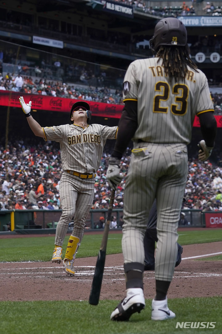[샌프란시스코=AP/뉴시스] 샌디에이고 파드리스의 김하성(왼쪽)이 22일(현지시각) 미 캘리포니아주 샌프란시스코의 오라클 파크에서 열린 2023 메이저리그(MLB) 샌프란시스코 자이언츠와의 경기 4회 초 1점 홈런을 치고 들어와 세리머니하고 있다. 김하성은 3타수 1안타(1홈런) 1타점 1득점 2볼넷을 기록했고 팀은 10-0으로 완승했다. 2023.06.23.