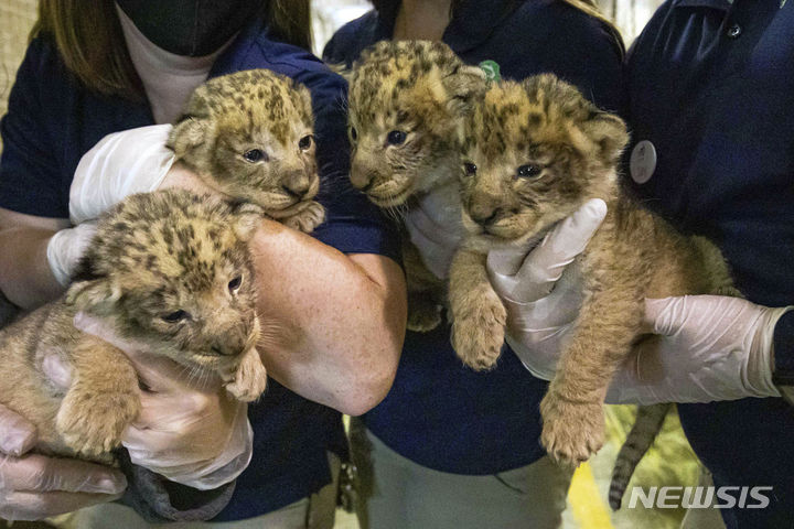 [버펄로=AP/뉴시스] 22일(현지시각) 미 뉴욕주 버펄로에 있는 버펄로 동물원에서 생후 약 20일 된 새끼 아프리카 사자 네 마리가 사육사들에게 안겨 있다. 이들은 엄마 사자 루사카와 아빠 사자 티베리우스 사이에서 지난 2일 밤 세 마리가 먼저 태어나고 다음 날 새벽 나머지 한 마리가 태어났다. 2023.06.23.