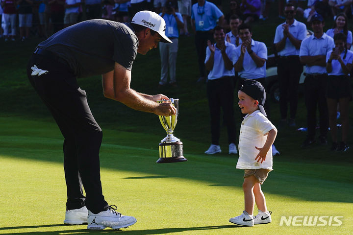 [크롬웰=AP/뉴시스] 키건 브래들리(미국)가 25일(현지시각) 미 코네티컷주 크롬웰의 TPC 리버하이랜즈에서 열린 미국프로골프(PGA) 투어 트래블러스 챔피언십 정상에 올라 트로피를 들고 아들과 기쁨을 나누고 있다. 브래들리는 최종 합계 23언더파 257타로 우승, 투어 통산 6승째를 기록하며 상금 360만 달러(약 47억2000만 원)를 거머쥐었다. 2023.06.26.