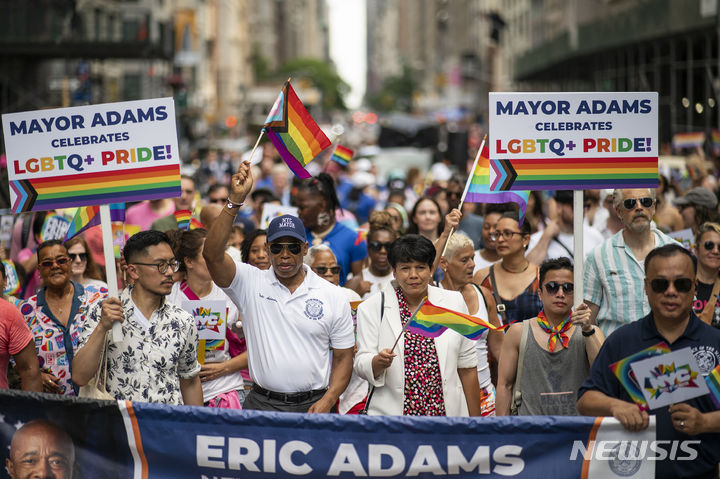 [뉴욕=AP/뉴시스] 에릭 애덤스(가운데) 뉴욕 시장이 25일(현지시각) 미국 뉴욕에서 열린 '뉴욕 프라이드 행진'에 참석해 행진하고 있다. 미국 최대의 성소수자 축제인 '뉴욕 프라이드 행진'에 7만5천여 명이 참가한 것으로 알려졌다. 2023.06.25.