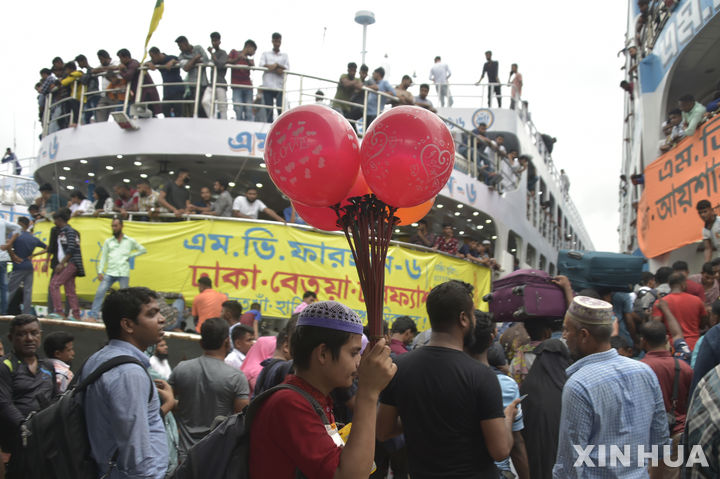 [다카=신화/뉴시스] 이슬람 최대 명절 중 하나인 '이드 알 아드하'(희생절)를 앞둔 27일(현지시각) 방글라데시 다카의 사다르가트 여객선 터미널에 사람들이 몰려들고 있다. 이드 알-아드하가 다가오면서 수많은 사람이 고향 집에서 일가친척과 함께 이 축제를 즐기기 위해 다카를 빠져나가고 있다. 2023.06.28.