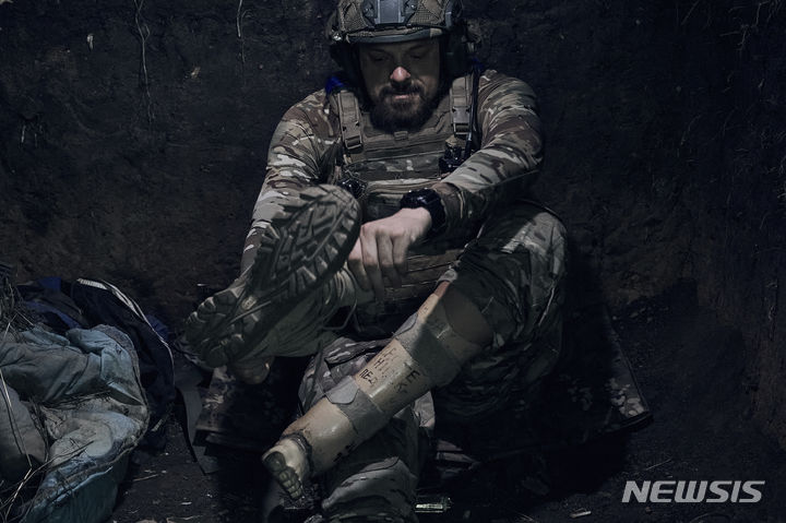 [자포리자=AP/뉴시스] 러시아군과의 전투에서 다리를 잃고 의족을 착용한 채 전선에 복귀한 우크라이나 군인(암호명 망치)이 1일(현지시각) 자포리자 전선 참호에 앉아 있다. 2023.07.02.