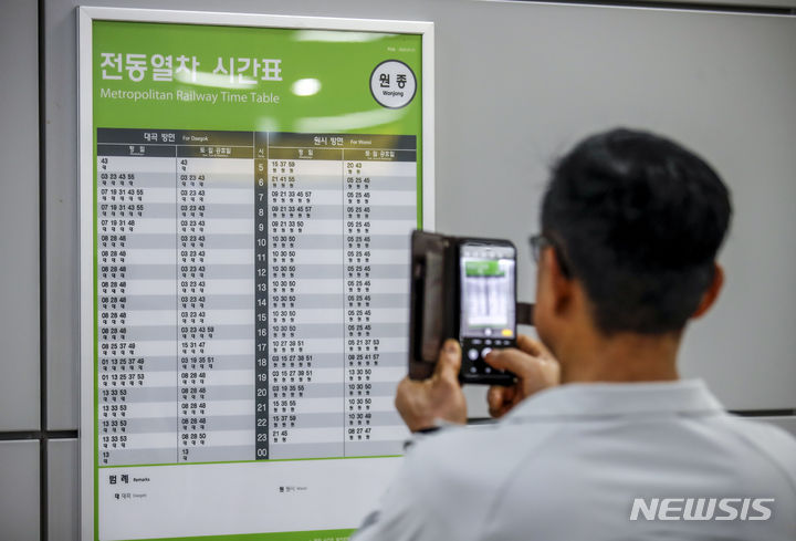 [부천=뉴시스] 정병혁 기자 = 2일 경기 부천시 서해선 원종역에 서 한 시민이 전동열차 시간표를 바라보고 있다. 서해선 복선전철 대곡∼소사 구간이 1일 개통됐다. 대곡~소사 복선전철 사업은 고양시 대곡역을 출발해 김포공항역을 거쳐 경기도 부천시 소사역을 잇는 사업으로, 수도권 서부에서 30분 만에 서울 진입이 가능해졌다. 2023.07.02. [email protected]