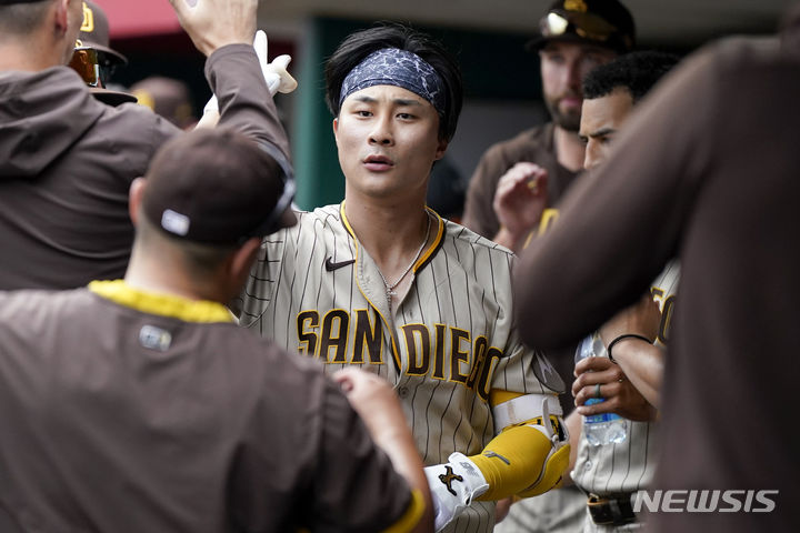 [신시내티=AP/뉴시스] 샌디에이고 파드리스의 김하성이 2일(현지시각) 미 오하이오주 신시내티의 그레이트아메리칸볼파크에서 열린 2023 메이저리그(MLB) 신시내티 레즈와의 경기 8회 초 1점 홈런(시즌 10호)을 친 후 더그아웃에서 환영받고 있다. 김하성은 3타수 1안타 1타점 1득점 1볼넷을 기록했고 팀은 3-4로 졌다. 2023.07.03.