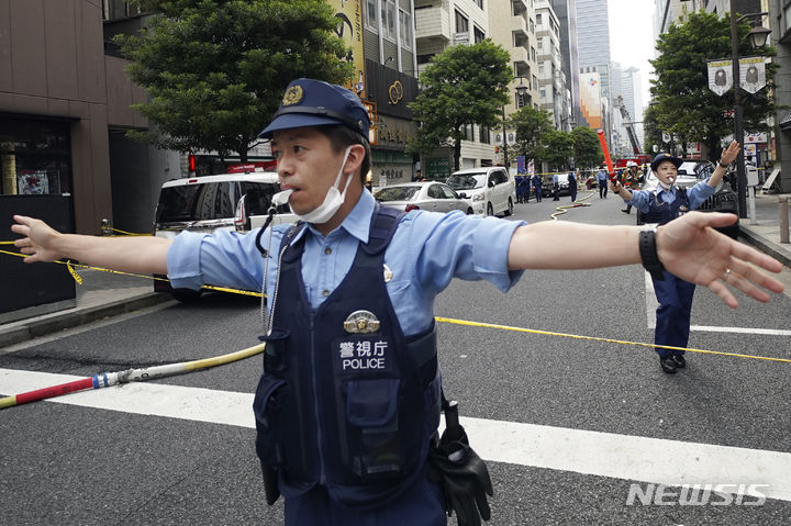 [도쿄=AP/뉴시스] 3일 일본 도쿄 상업지구 신바시의 한 건물에서 폭발이 일어나 경찰관들이 주변을 통제하고 있다. 8층짜리 건물에서 폭발이 발생해 유리창이 깨지고 연기가 뿜어져 나왔으며 4명이 경상을 입었다. 경찰은 건물 2층 음식점에서 가스가 폭발한 것으로 보고 조사하고 있다. 2023.07.03.