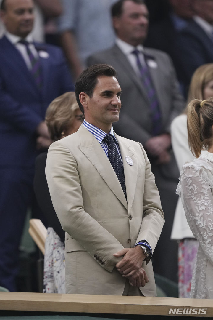 [런던=AP/뉴시스] '테니스 황제' 로저 페더러(스위스)가 4일(현지시각) 영국 런던에서 열리는 2023 윔블던 테니스 대회 여자 단식 이틀째 센터코트 귀빈석에서 관중의 기립박수를 받고 있다. 대회 조직위는 이 대회를 8차례 우승하고 지난해 은퇴한 페더러에 대한 예우로 2분간의 기립박수 이벤트를 마련했다. 2023.07.05.