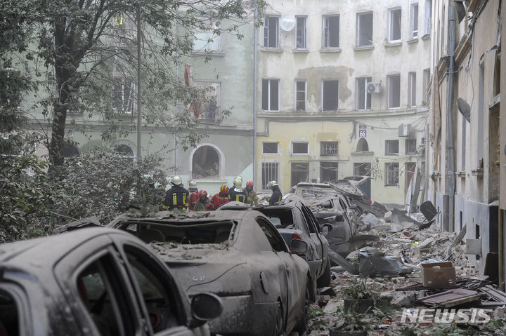[르비우=AP/뉴시스] 6일(현지시각) 우크라이나 르비우에서 구급대원들이 러시아의 미사일 공격으로 파손된 건물 주변에 모여 있다. 안드리 사보디 르비우 시장은 러시아가 최전선에서 멀리 떨어진 우크라이나 서부 도시에 순항미사일을 발사해 아파트 단지 주민 최소 4명이 숨지고 어린이 포함 30여 명이 다쳤다고 밝혔다. 2023.07.06.