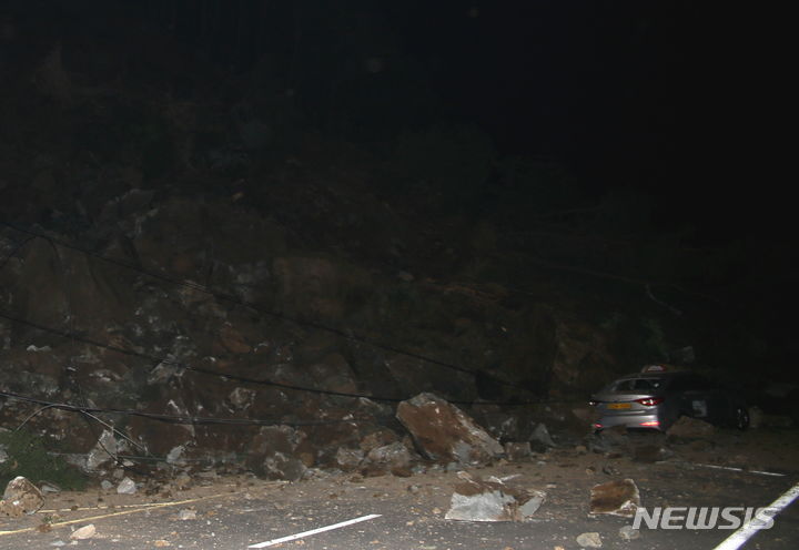 [정읍=뉴시스] 김종효 기자 = 지난 6일 오후 11시55분께 산사태가 발생한 정읍 내장호 인근 도로. 갑작스런 산사태로 내장산국립공원으로 향하는 도로가 전면 통제되고 있다. 산사태 발생 구간 초입에 택시 1대가 낙석에 깔려 있는 모습이다. 다행이 운전자와 승객은 다치지 않은 것으로 전해졌다. 2023.07.07. [email protected]