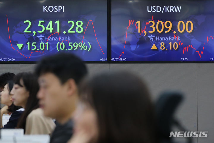 [서울=뉴시스] 권창회 기자 = 코스피가 전 거래일 대비 8.88포인트(0.35%) 하락한 2547.41에 출발했다. 원달러 환율은 7.1원 오른 1308원으로, 코스닥지수는 2.45포인트(0.28%) 내린 868.08에 거래를 시작했다. 7일 오전 서울 중구 하나은행 딜링룸에서 딜러들이 업무를 보고 있다. 2023.07.07. [email protected]