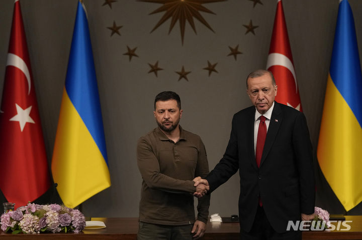 [이스탄불=AP/뉴시스]레제프 타이이프 에르도안 튀르키예 대통령(오른쪽)과 볼로디미르 젤렌스키 우크라이나 대통령이 7일(현지 시간) 이스탄불에서 공동기자회견을 마치고 악수하고 있다. 2023.7.8.