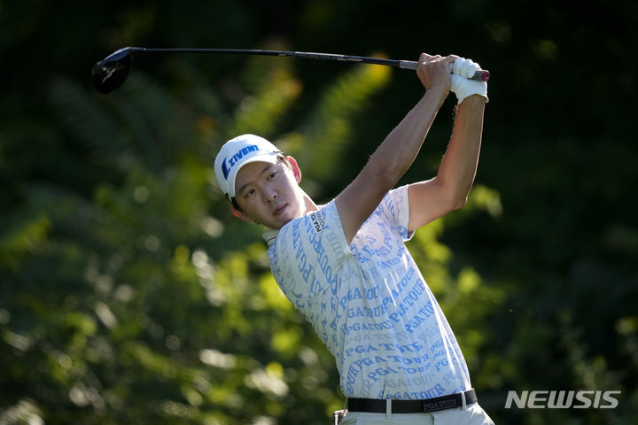 [실비스=AP/뉴시스] 노승열이 7일(현지시각) 미 일리노이주 실비스의 TPC 디어런에서 열린 미국프로골프(PGA) 투어 존디어 클래식 2라운드 2번 홀에서 티샷하고 있다. 노승열은 중간 합계 5언더파 137타 공동 45위를 기록했다. 2023.07.08.