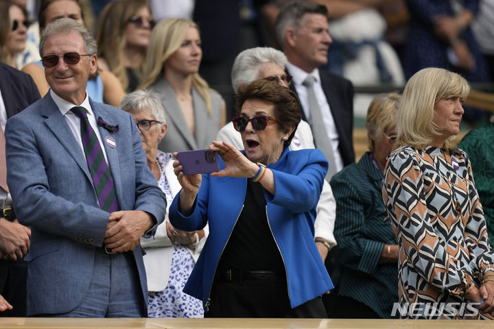 [런던=AP/뉴시스] 테니스 전설 빌리 진 킹(가운데)이 8일(현지시각) 영국 런던에서 열린 2023 윔블던 테니스 대회 남자 단식 3회전 카를로스 알카라스(1위·스페인)와 니콜라스 재리(28위·칠레)의 경기를 휴대폰으로 찍고 있다. 이 경기에서 알카라스는 3시간 56분의 승부 끝에 재리를 3-1(6-3 6-8 6-3 7-5)로 꺾고 16강에 올랐다. 2023.07.09.