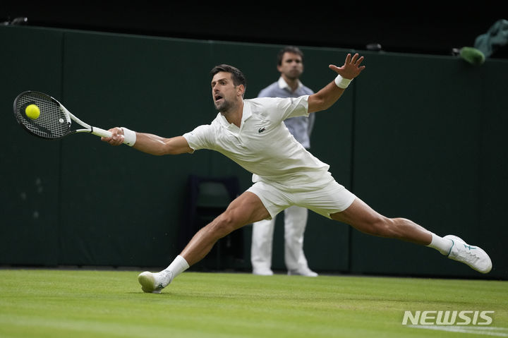 [런던=AP/뉴시스] 노바크 조코비치(2위·세르비아)가 9일(현지시각) 영국 런던에서 열린 2023 윔블던 테니스 대회 남자 단식 16강전에서 후베르트 후르카치(18위·폴란드)와 경기하고 있다. 조코비치가 2-0(8-6 8-6)으로 앞선 상황에서 시간상 경기가 다음 날로 연기됐다. 2023.07.10.