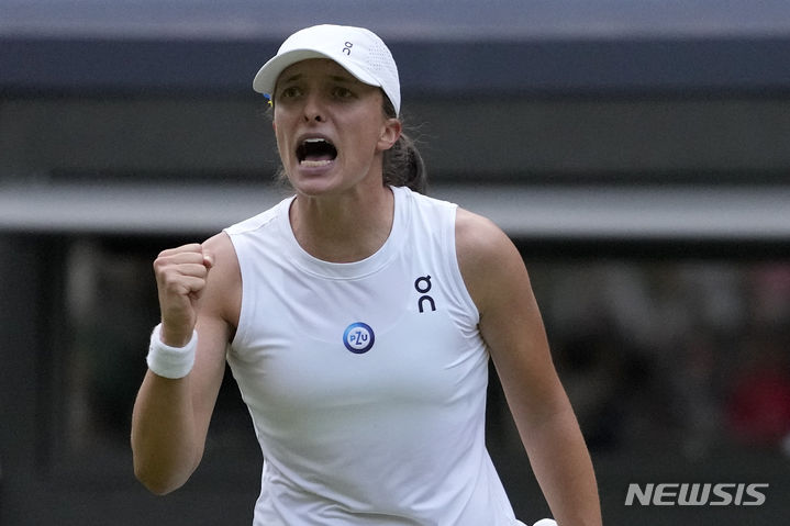 [런던=AP/뉴시스] 이가 시비옹테크(1위·폴란드)가 9일(현지시각) 영국 런던에서 열린 2023 윔블던 테니스 대회 여자 단식 16강전에서 벨린다 벤치치(14위·스위스)를 꺾은 후 환호하고 있다. 시비옹테크는 2-1(6-7<4-7> 7-6<-7-2> 6-3)로 역전승을 거두며 8강에 올랐다. 2023.07.10.