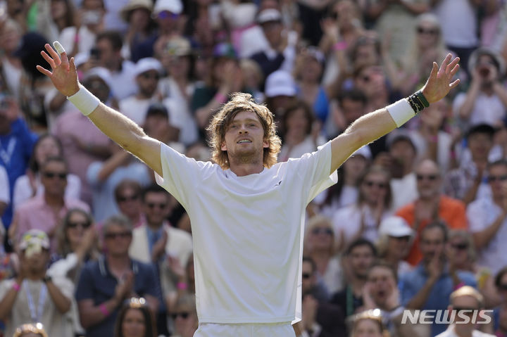 [런던=AP/뉴시스] 안드레이 루블레프(7위·러시아)가 9일(현지시각) 영국 런던에서 열린 2023 윔블던 테니스 대회 남자 단식 16강전에서 알렉산더 부블리크(26위·카자흐스탄)를 물리친 후 기뻐하고 있다. 루블레프는 풀세트 접전 끝에 3-2(7-5 6-3 6-7<6-8> 6-7<5-7> 6-4)로 승리하고 8강에 올랐다. 2023.07.10.