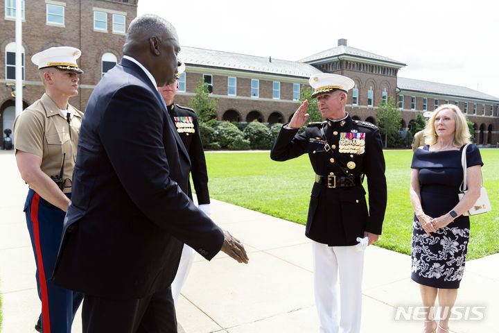 [워싱턴=AP/뉴시스] 에릭 스미스(오른쪽 두 번째) 미 해병대 부사령관이 10일(현지시각) 워싱턴에서 열린 데이비드 버거 사령관 퇴임식 중 로이드 오스틴 국방장관에게 인사하고 있다. 이날로 임기가 만료된 버거 사령관의 후임은 상원의 인준을 받지 못 해 해병대 역사상 처음으로 사령관 공백 사태가 빚어졌으며 당분간 스미스 부사령관이 직무대행 한다. 2023.07.11.