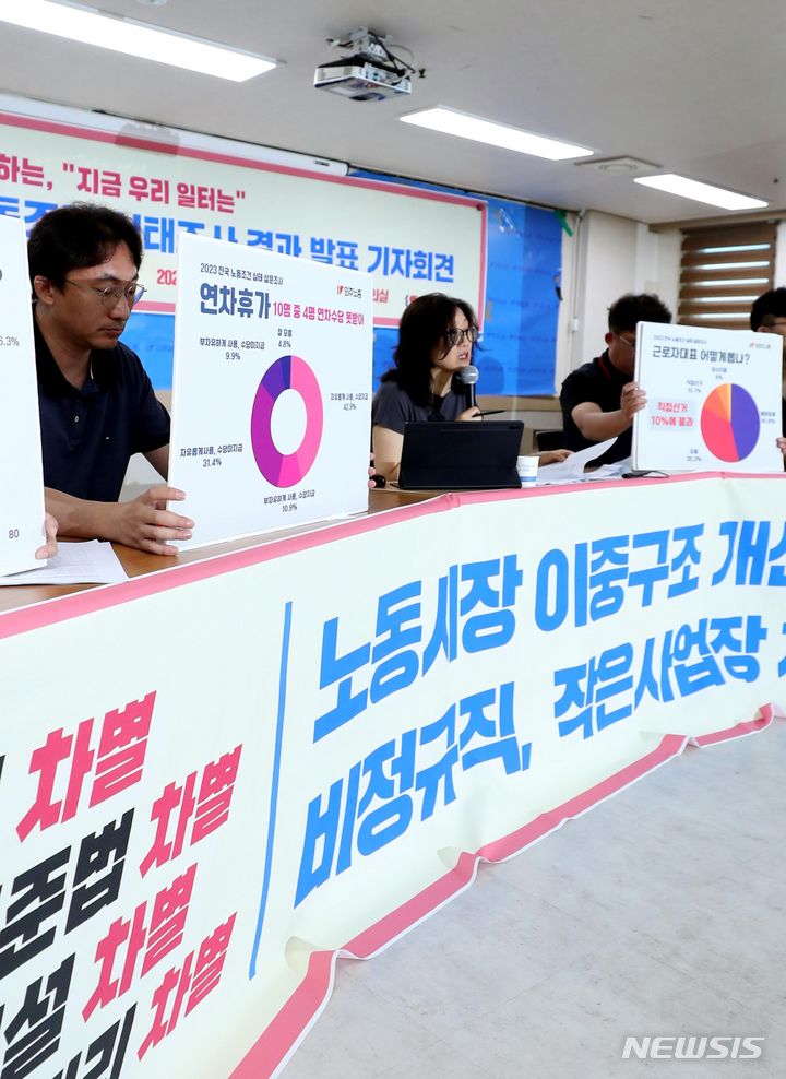 [서울=뉴시스] 조성봉 기자= 11일 오전 서울 중구 민주노총 회의실에서 열린 ‘2023년 전국 노동조건 실태조사’ 발표 기자회견에서 정경은 민주노총 부설 민주노동연구원 연구위원이 발언을 하고 있다. 2023.07.11. [email protected]