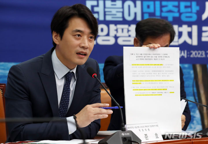 [서울=뉴시스] 이영환 기자 = 11일 오전 서울 여의도 국회에서 열린 서울-양평 고속도로 원안 및 신양평IC 설치 추진위원회 발족식 및 1차회의에서 한준호 위원이 발언을 하고 있다. 2023.07.11. [email protected]